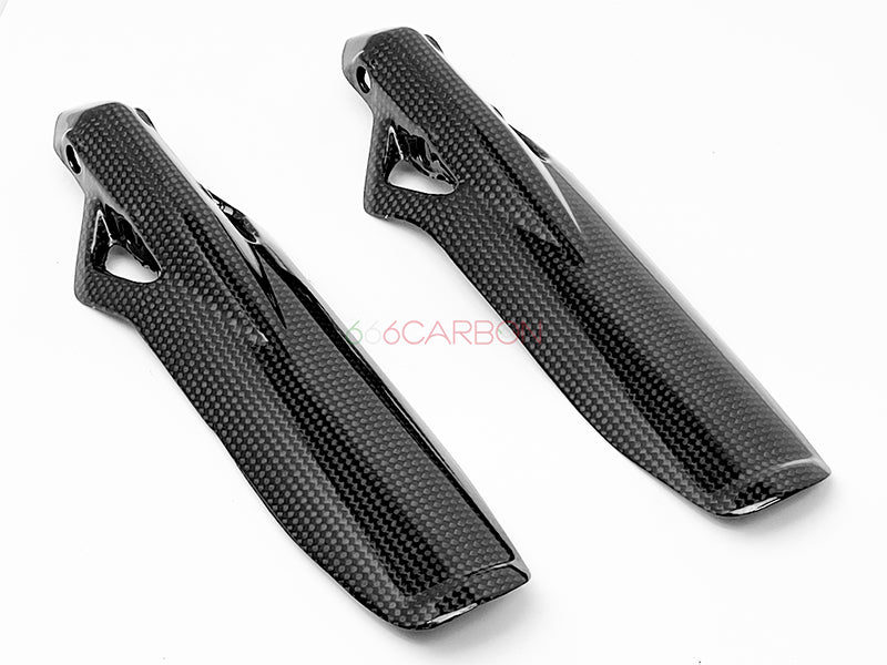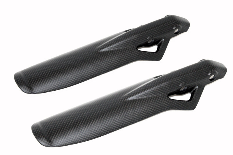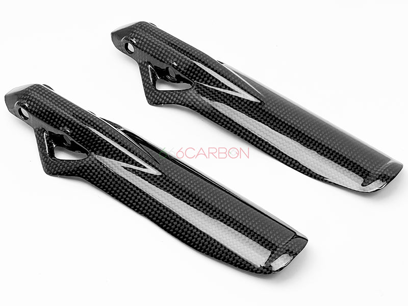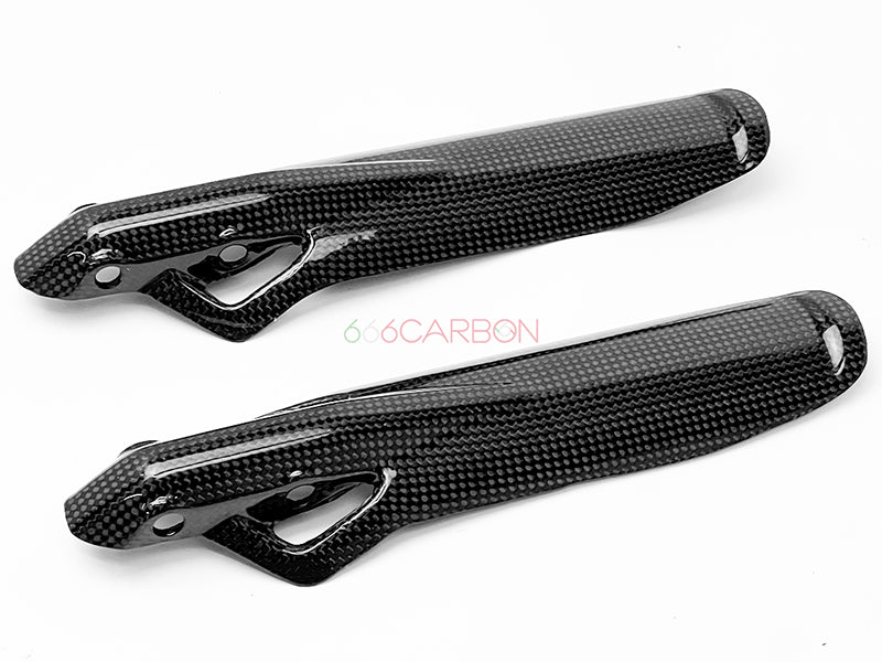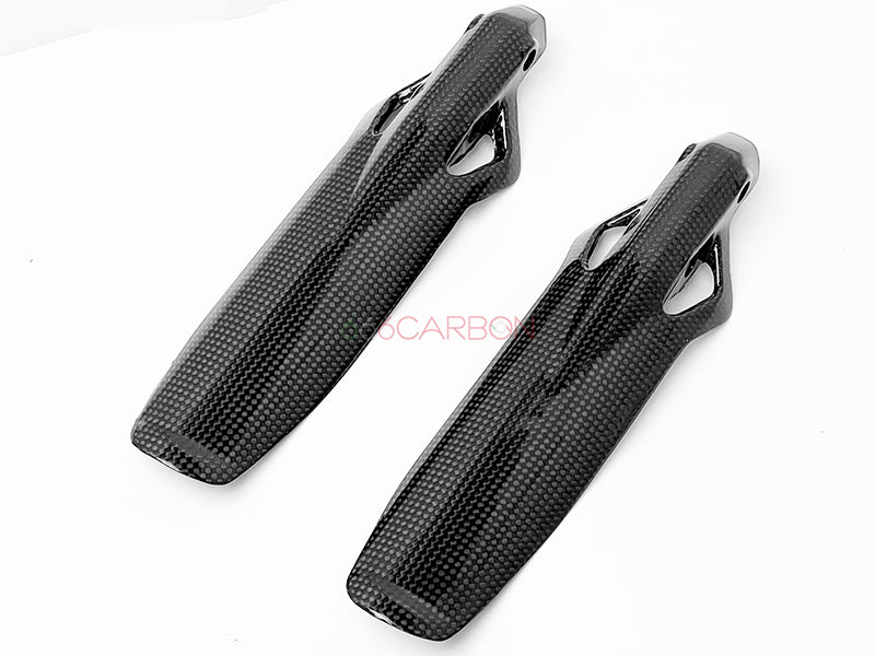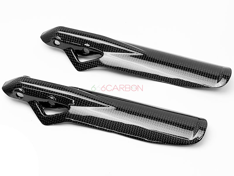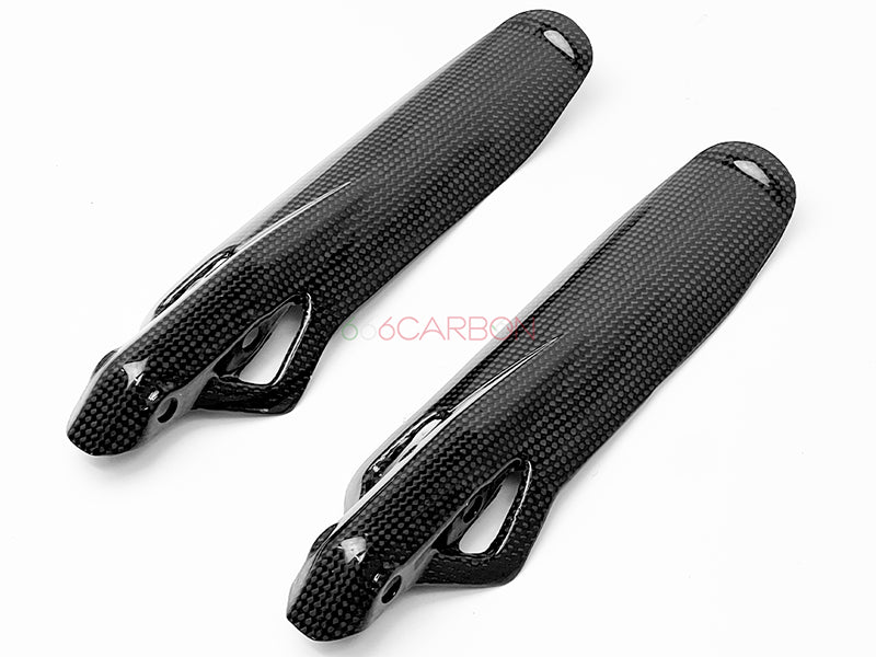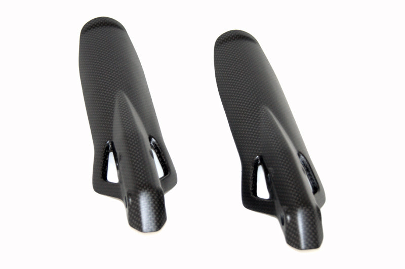 Coppia parasteli forcelle in fibra di carbonio. Trama "PLAIN" (la stessa dei pezzi Ducati Performance). Montaggio facile e veloce, non richiede modifiche di alcun tipo, si sostituiscono agli originali. Finitura trasparente opaca anti UV. Peso: 48 GR.